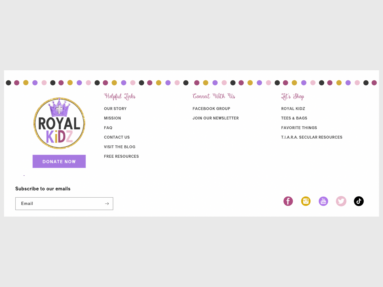 The footer required a custom design, and a clickable 'Donate Now' button. Together with custom fonts, additional columns, and personalized social media icons